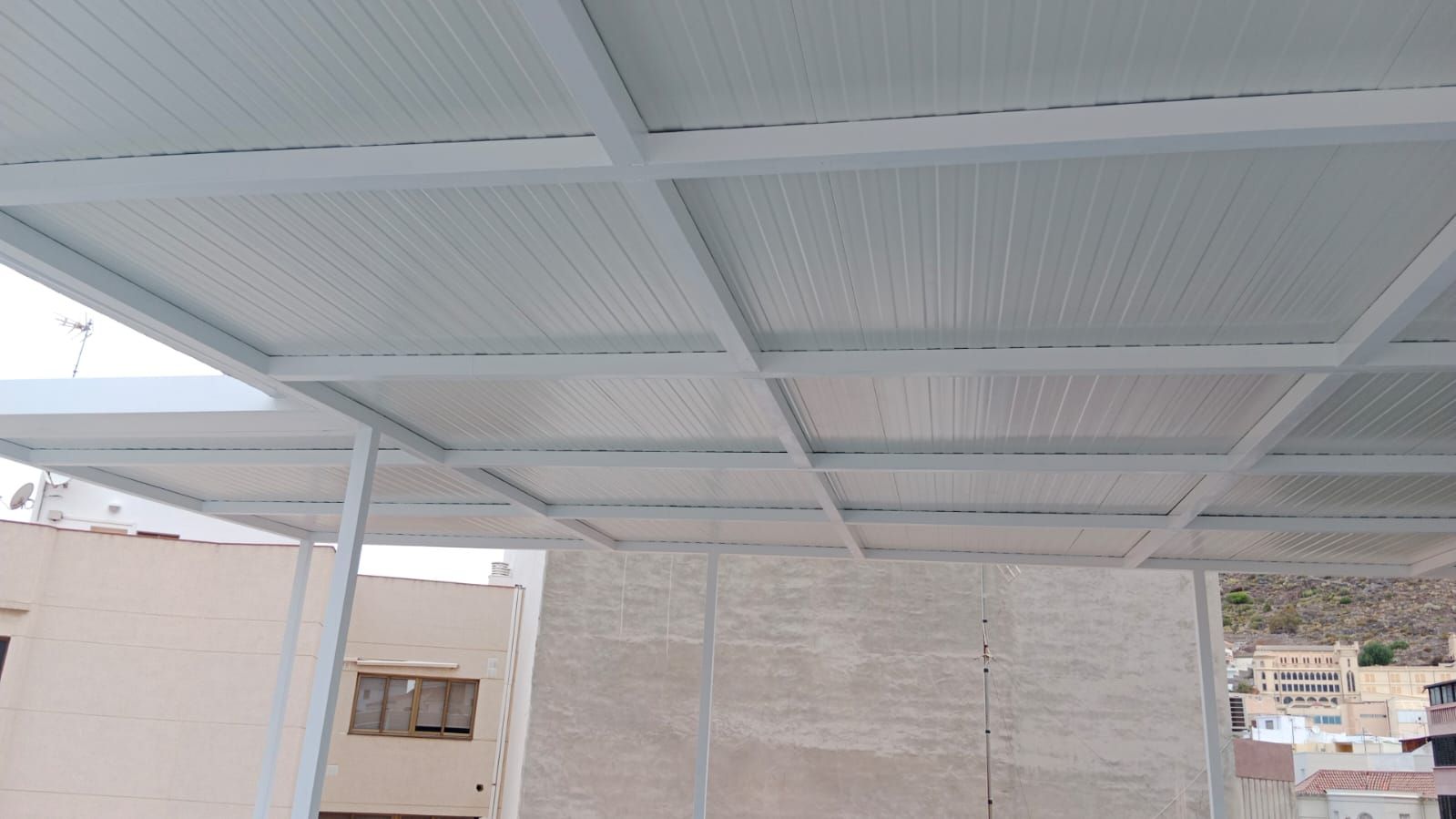 Estructura metálica 130 metros cuadrados, en una azotea en edificio de vivienda,y una cubierta con plancha Zangui, desagües, posteriormente se colocarán fijos de cristal y puertas en acordeón, para hacer una estancia de disfrute ,cenas, zona de juegos para niños.